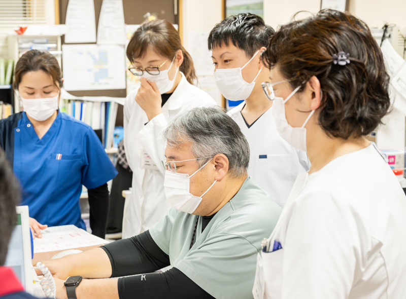 患者さまごとに、定期的に各スタ ッフが集まって合同カンファレンスを行います。情報を共有し、 患者さまの変化に合わせて治療プログラムの変更などについて話し合い、患者さま一人ひとりの状態をスタッフ全体で把握できるようにしていきます。