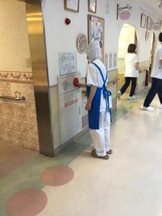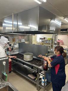 厨房職員が火災報知機を押します