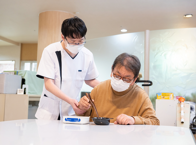 当施設では、食事場面を「リハビリスタッフ」「管理栄養士」で観察させていただき、実際のお食事の摂取状況から咀嚼能力・口腔機能・嚥下機能・姿勢などに関して評価を行います。