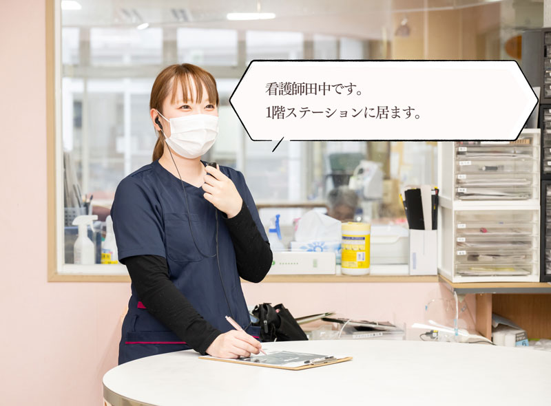 当施設では業務の効率化を目的にインカムによる情報共有を行っています